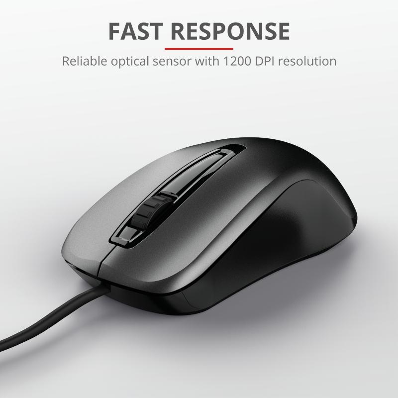 Mouse cu fir Trust Carve USB Mouse Specifications General Height of main product (in mm) 38 mm Width of main product (in mm) 62 mm Depth of main product (in mm) 121 mm Total weight 84 g Weight of main unit 62 g Formfactor standard Ergonomic design no Connectivity Connection type wired Bluetooth no USB version 2.0 Connector type USB-A male Features Silent click no Software no DPI adjustable no Gaming Designed for gaming no Lighting Lights no Input Power source USB Sensor DPI 1200 Max. DPI 1200 dpi Sensor technology optical Compatibility Compatible Software Platforms Windows, Mac OS, Chrome OS Compatible Device Types laptop, pc Control Grip type palm, finger, claw Horizontal scrolling no Controls left, right, mid Number of buttons 3 DPI button no Programmable buttons no Adjustable weight no Suitable surface non-reflective flat surface Left-right handed use right-handed, left-handed Scroll wheel yes Trackball no https://www.trust.com/en/product/23733-carve-usb-mouse